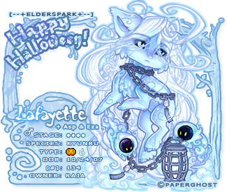 # Natural abilities: Well, this certainly isn't a kyunru playing dress up. This poor guy is dead! Well.. ok, that's being a little dramatic. The truth of the matter is, he has such a high concentration of the "Spirit" type element in his blood that he was actually born a ghost. Go figure. Anyway, he has all of the abilities you might associate with a ghost. He can become invisible, float through objects, teleport short distances, etc. He does have a bit of trouble interacting with corporeal objects, but it's possible with some concentration. The ghost is also able to enter a person's dream while their sleeping, and interact with their subconscious mind. And in case you were wondering, yes, he is perfectly able to breed @w@
